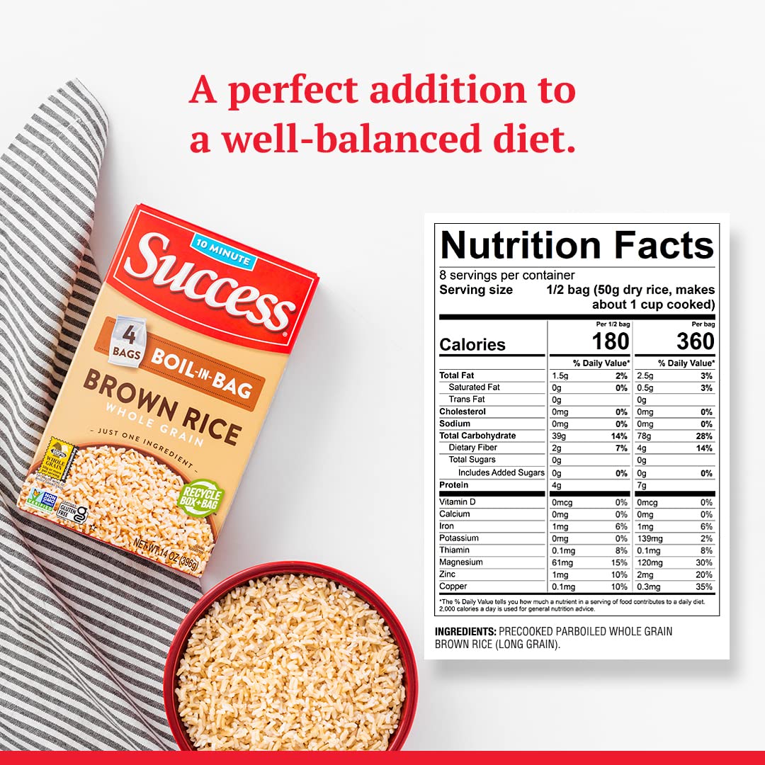 Need a hand with some quick meals and sides for your family? Success presents our Boil-in-Bag Rice, made for fast and easy dishes without the mess! No preservatives are added to this product, and our brown whole-grain rice is also non-GMO, gluten-free, and perfect for vegans and vegetarians. Our natural brown rice is fluffy, delicious, and MSG-free, making it a wonderful ingredient for a well-balanced diet. You can cook the rice either in the microwave or in a pot on your stovetop, and there are specific instructions on the box for both options. All you need is some water and our rice! For easy microwavable rice, place the bag in the specified amount of water in a microwave-safe dish and cook on high for 10 minutes. To cook on the stove top, place the rice bag in the amount of water the instructions specify and boil uncovered for 10 minutes. Both ways provide you with delicious, light, and fluffy rice that is great for any meal. Serve this quality brown rice in dinner casseroles, stir fry, fried rice, and other yummy cuisines and dishes. These grains help provide the delicious taste your family needs in a meal with nothing added but convenience!Success knows that your days can get busy, and we understand that you still want to enjoy time with your family. That's why we provide you with our natural, gluten-free rice for fast meals that fit in your day. All of our white and brown rice is grown in the USA. Each box of Success gives you delicious and fast dinners that save you time with cooking and kitchen cleanup. All of our rice is tasty and satisfying, and we only use rice as our one simple ingredient. You and your family deserve to enjoy a satisfying meal together, and Success Boil-in-Bag Rice helps you make quick meals without the mess for you and your loved ones.