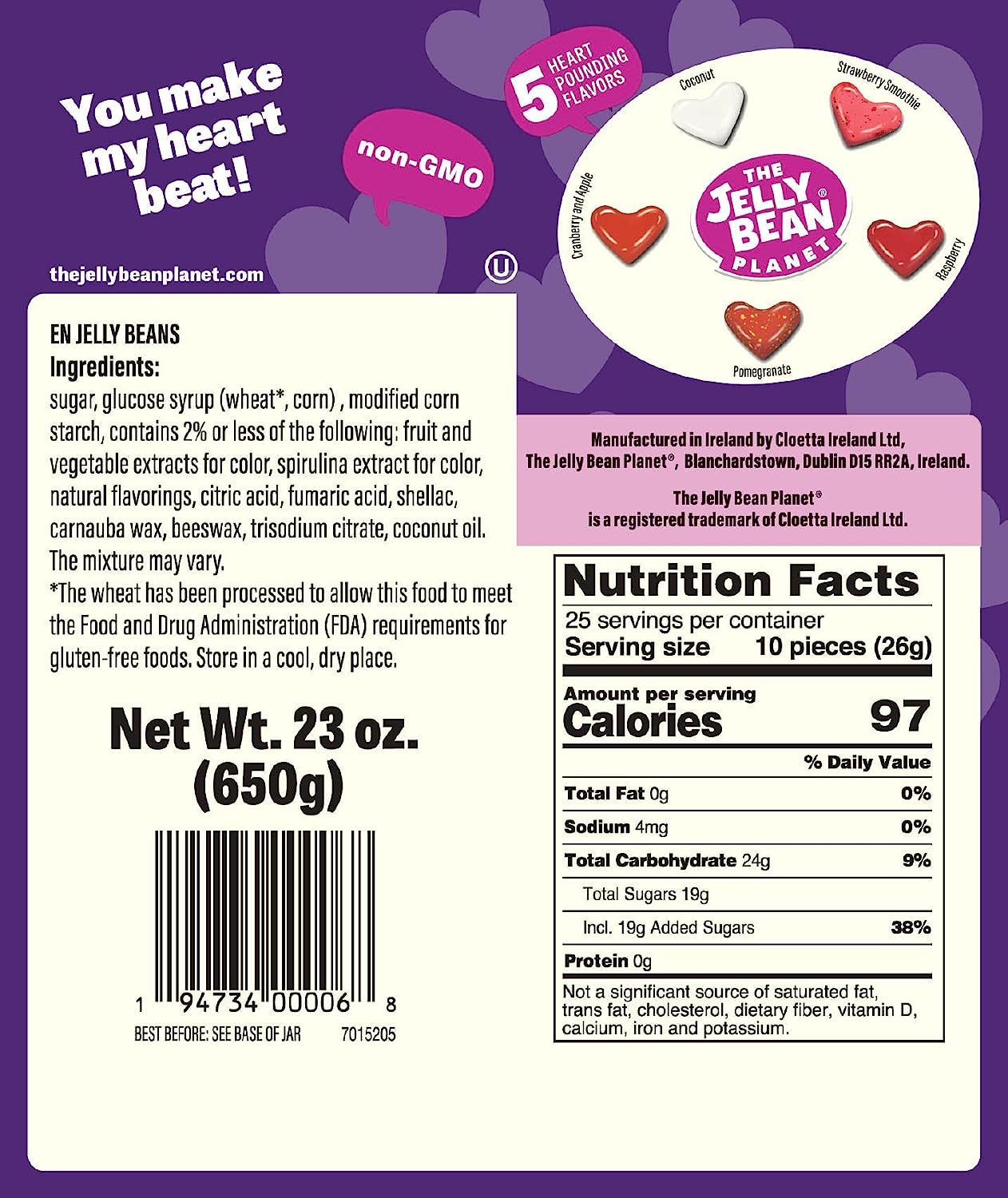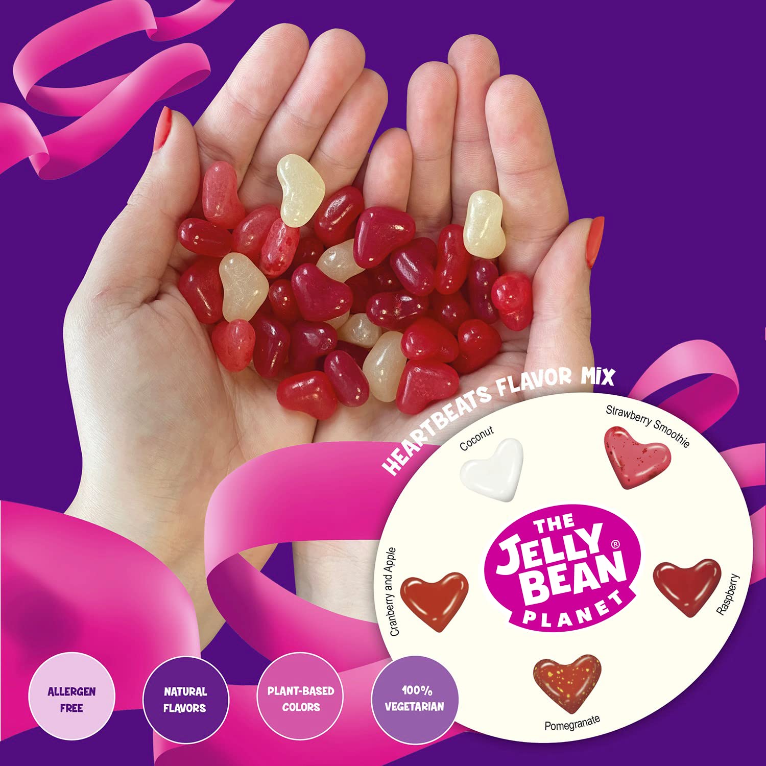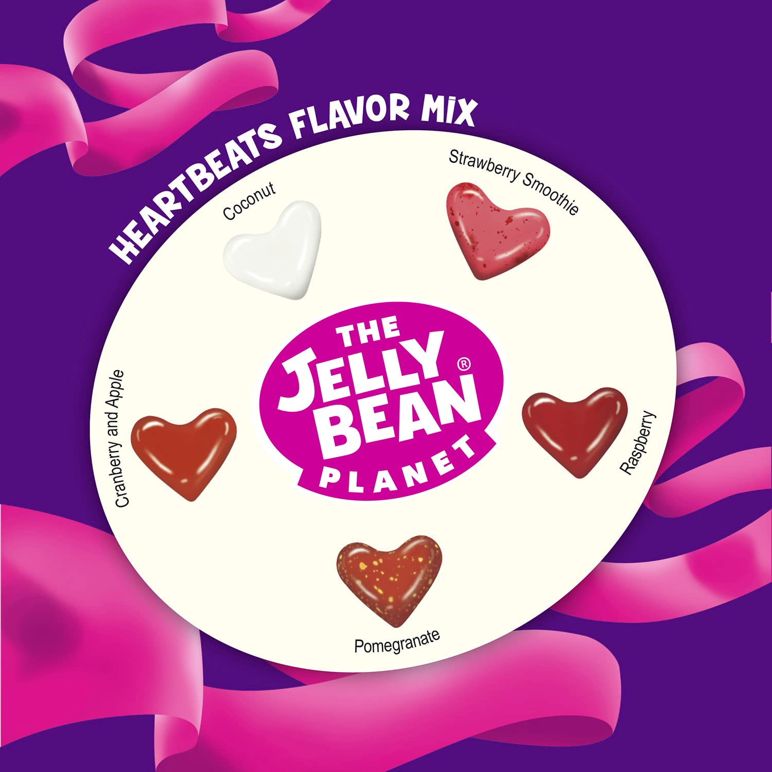The Jelly Bean Planet Heart Beats - 5 Flavors Gourmet Jelly Beans - Candy Bulk - Gluten Free - 100% Vegetarian - Love Sweets - Holidays Gift - Ideal for Mother's Day - Pink, Red & White Candy - Jar 650g (23oz)