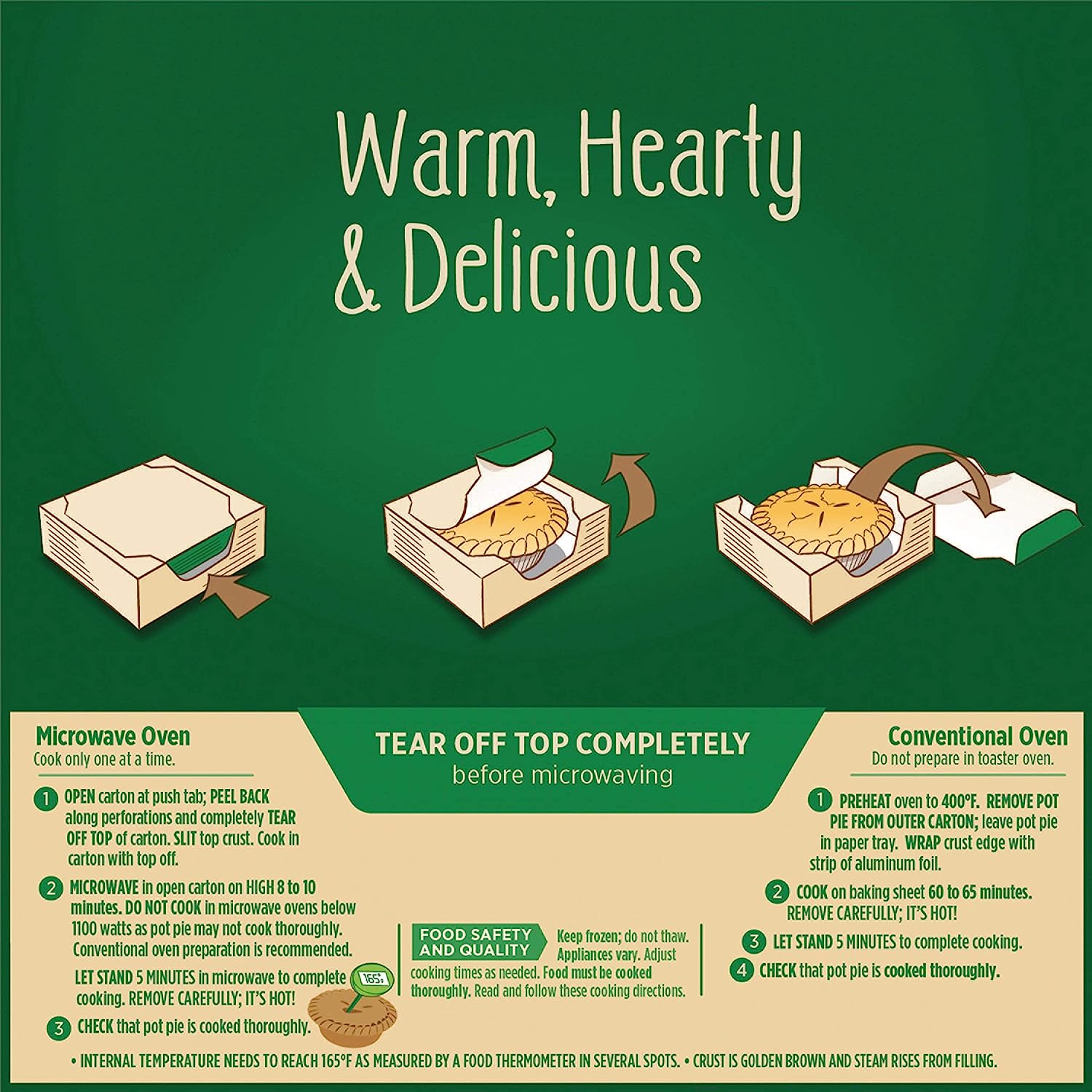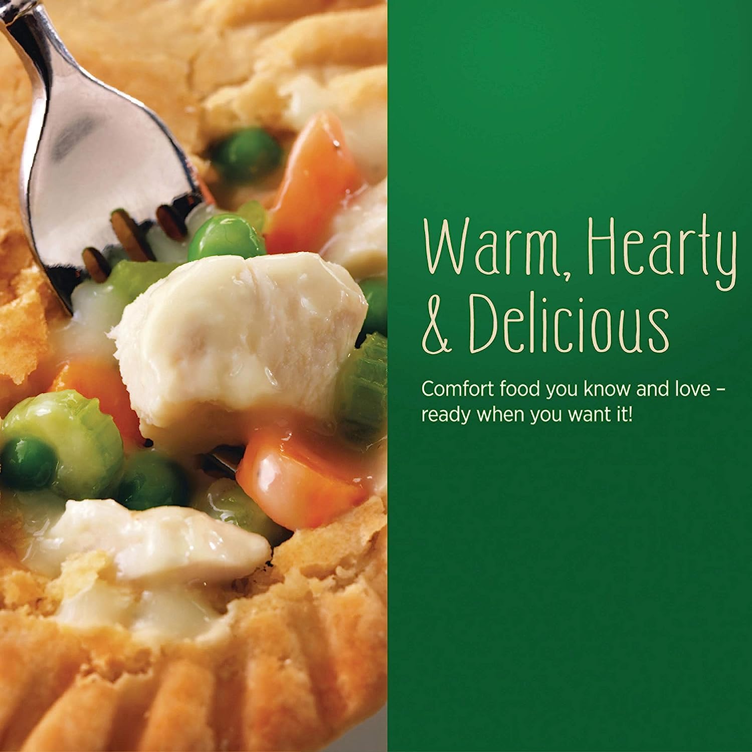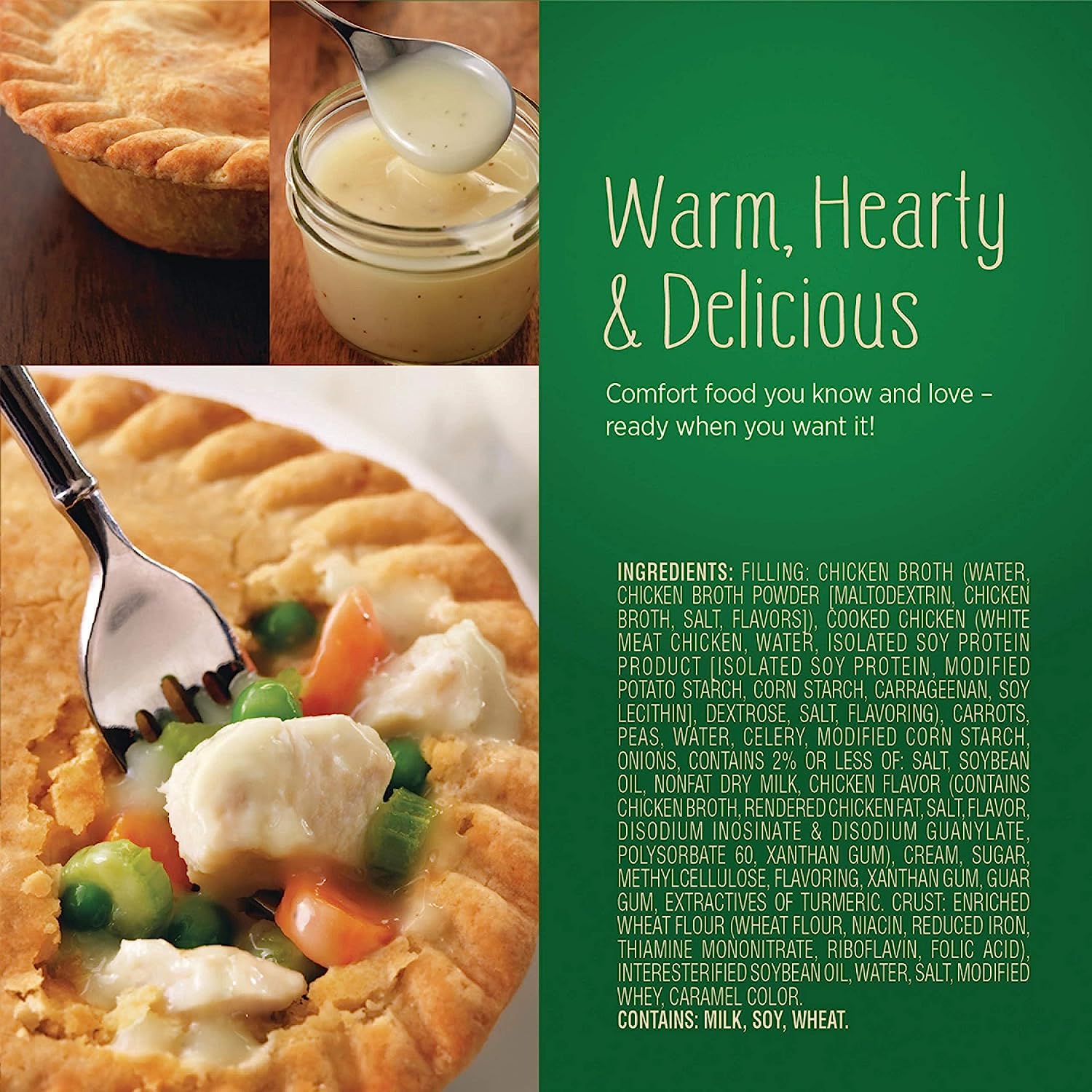 Warm up with a delicious, comforting Marie Callender's Chicken Pot Pie. Made with tender white-meat chicken, savory vegetables, and made-from-scratch gravy - all wrapped in a golden, flaky crust. With 11 g protein per serving, and no preservatives, artificial colors, or artificial flavors, this convenient meal can be microwaved or heated in the oven. Enjoy this warm, hearty, and delicious comfort food today.