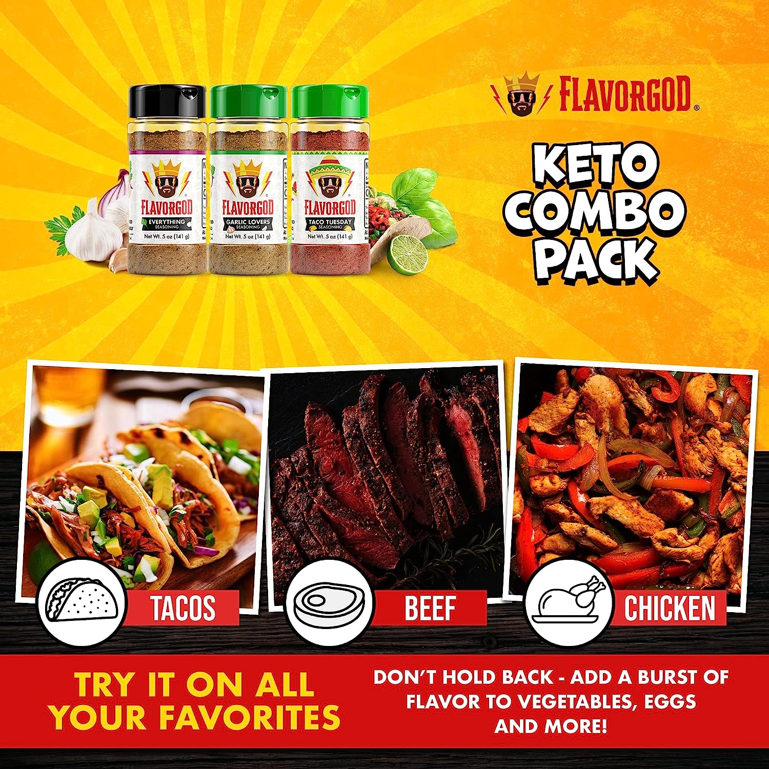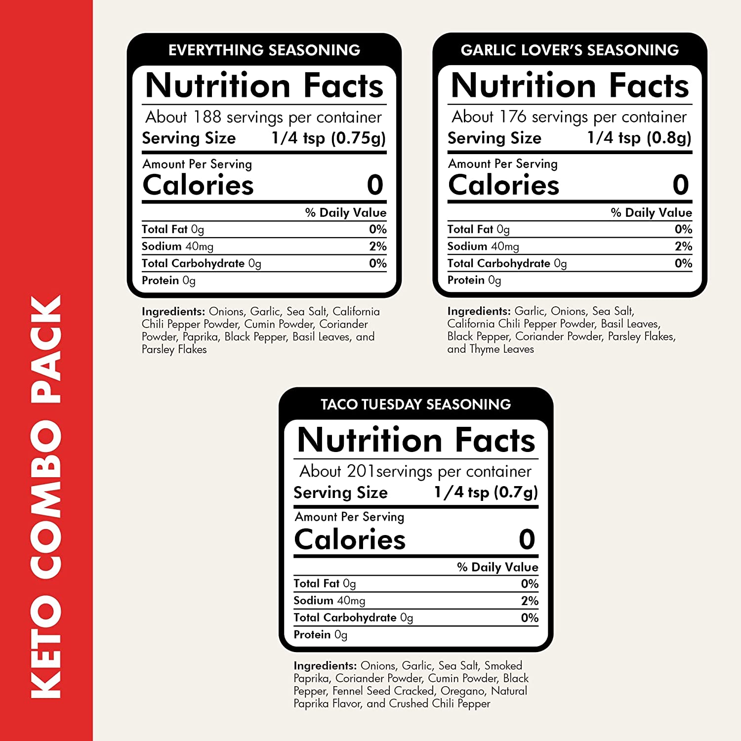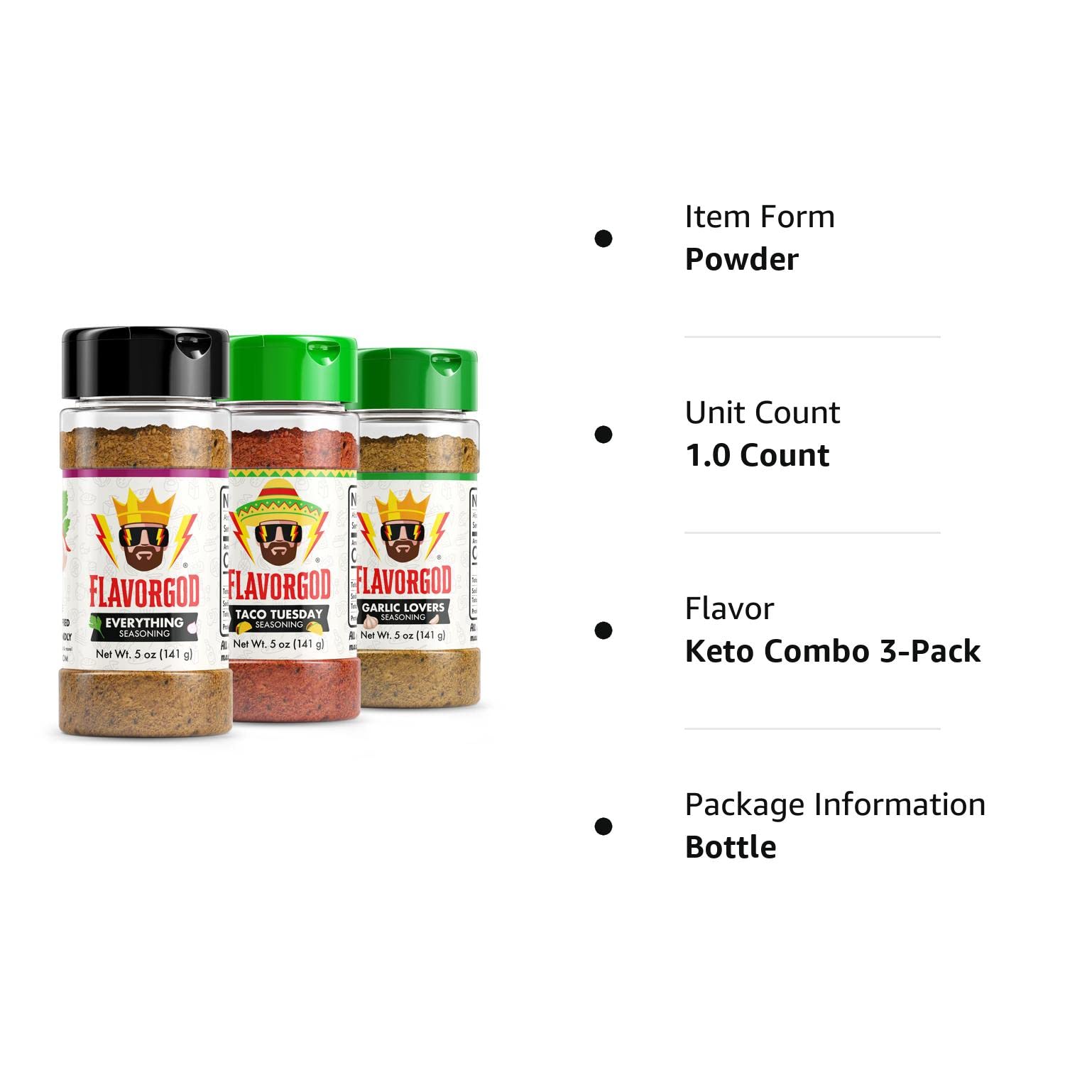 - KETO COMBO PACK: Flavor God Keto Combo Pack is the perfect complement to help achieve your Keto goals. Add delicious and dynamic flavors to every meal when you add our seasonings made with high-quality ingredients with no fillers. These seasonings all contain 0 carbs per serving and have no added sugar. This set of 3 includes 5 oz bottles of Everything Seasoning, Garlic Lovers Seasoning, and Taco Tuesday Seasoning.