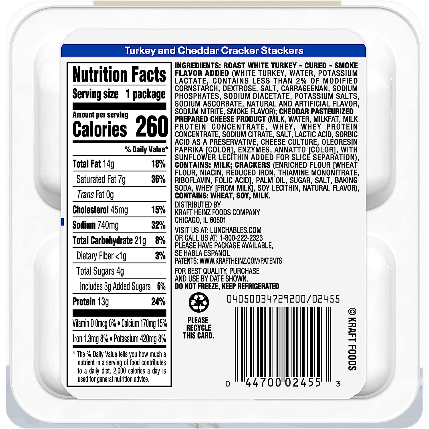 Lunchables Turkey and Cheddar with Crackers Lunch Combinations are the perfect on-the-go lunch while letting kids have fun with their food. Each convenient lunch kit includes Oscar Mayer White Meat Lean Turkey Slices, Kraft cheddar pasteurized prepared cheese product and crackers to create tasty stacked snacks. Our turkey and cheese crackers kit is a fast and fun option for school lunch, picnics, or on-the-go snacking. Every lunch kit provides a good source of calcium and an excellent source of protein per serving, with 12 grams of protein per serving. Add Lunchables for kids to your back to school supplies list. Keep Lunchables Turkey and Cheese Crackers refrigerated.