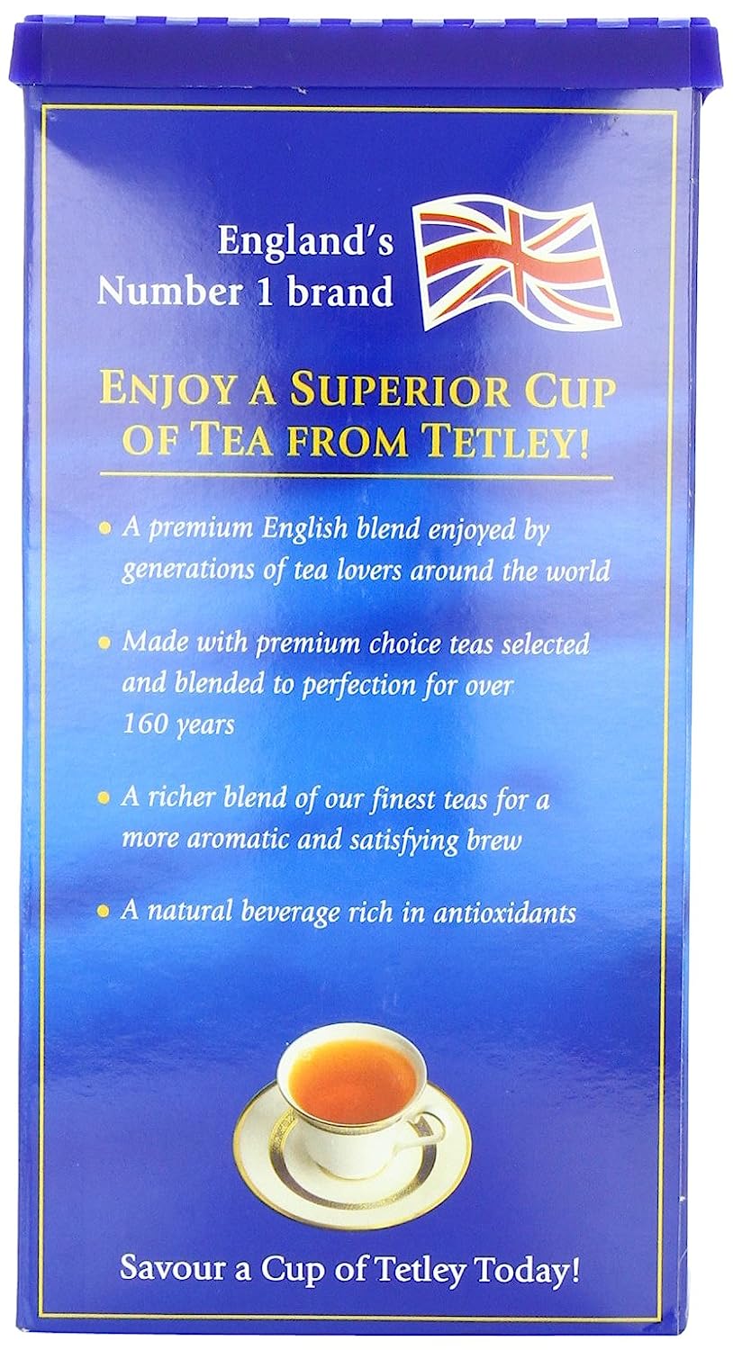 Tetley tea is the number one selling brand of tea. There's no better tea than Tetley. Tetley assures a perfect cup of tea every time. Enjoy a superior cup of tea from Tetley. Tetley's tea is a premium English blend enjoyed by generations of tea lovers around the world. Made with premium choice teas selected and blended to perfection for over 160 years. This is a richer blend of Tetley's finest teas for a more aromatic and satisfying brew. It is also a natural beverage that is rich in antioxidants. Don't forget to try our other wonderful flavors from Tetley: Elaichi, Masala, Ginger, Green Tea, Green Tea with Honey, Black and Green, and Golden Tips!